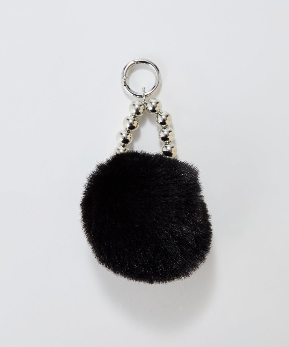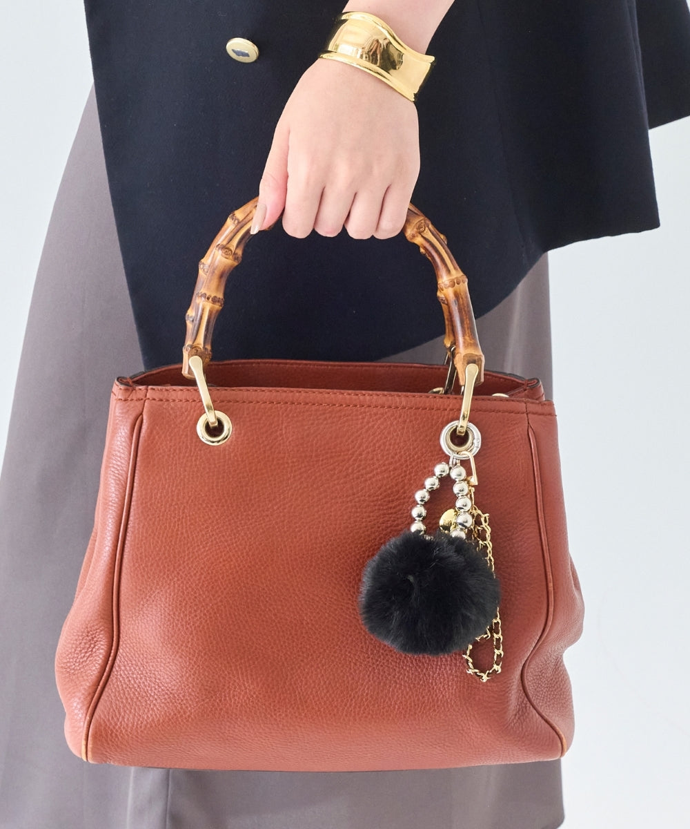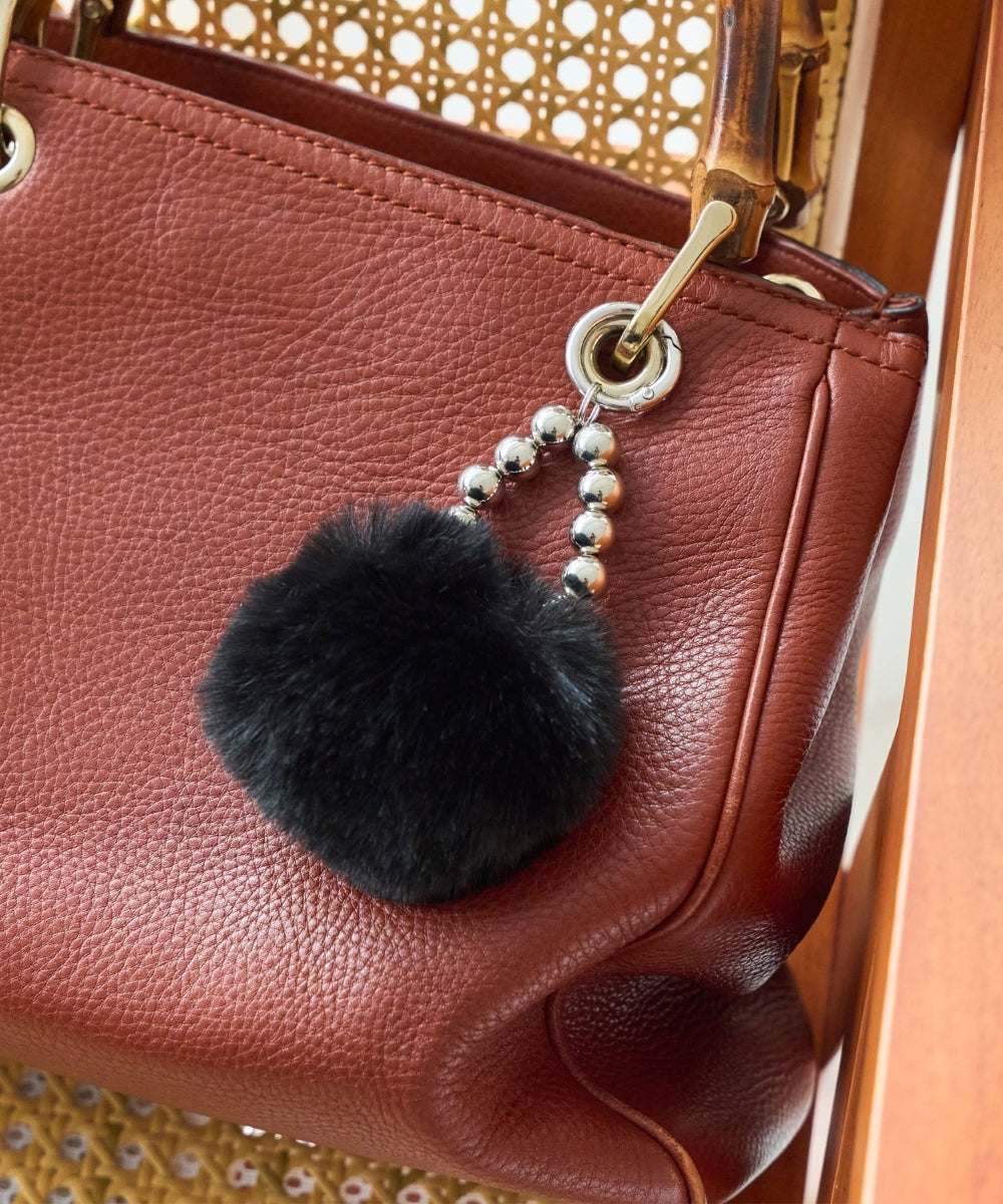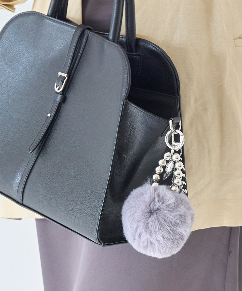 目を引くフェイクファーのバッグチャームが、いつもの装いに遊び心をプラス。