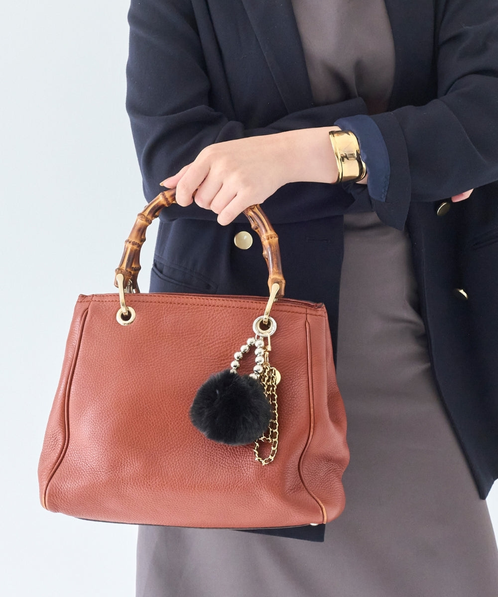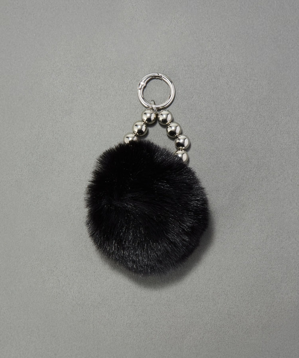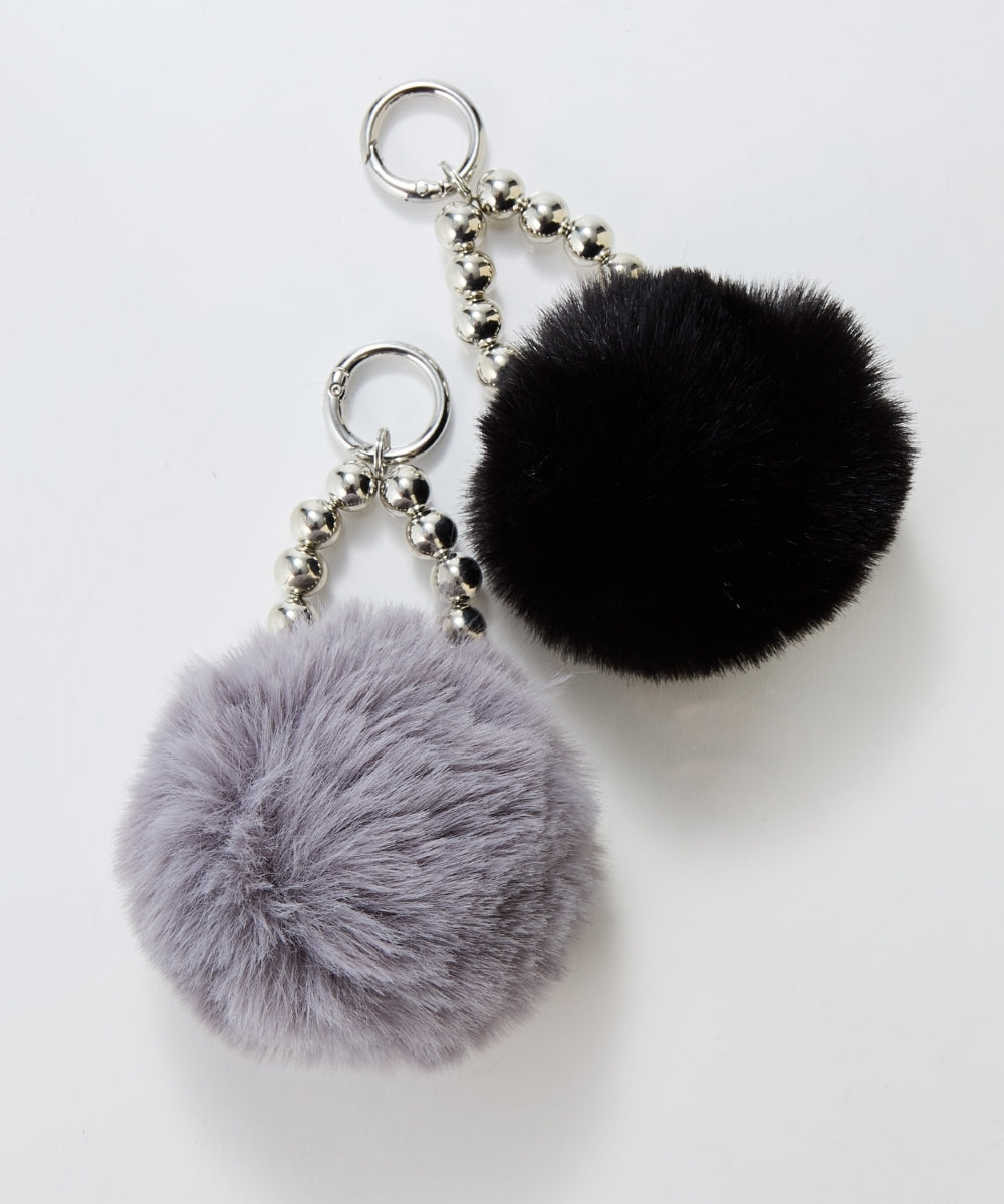 目を引くフェイクファーのバッグチャームが、いつもの装いに遊び心をプラス。