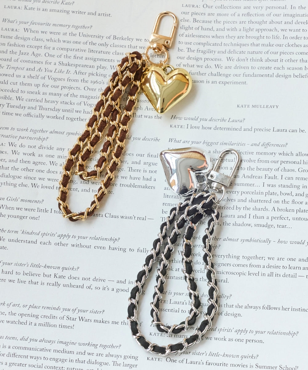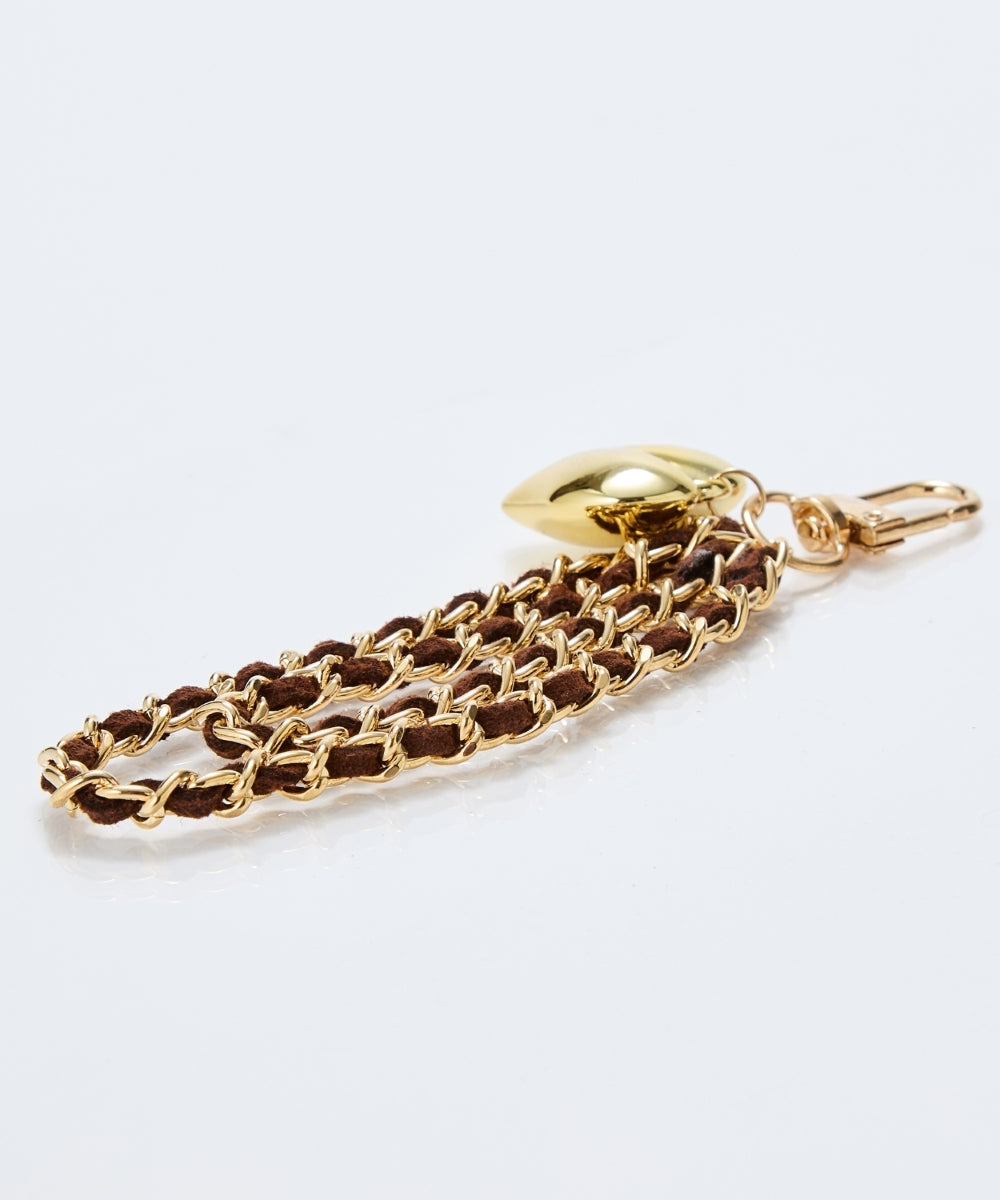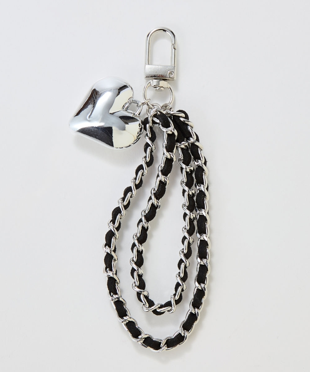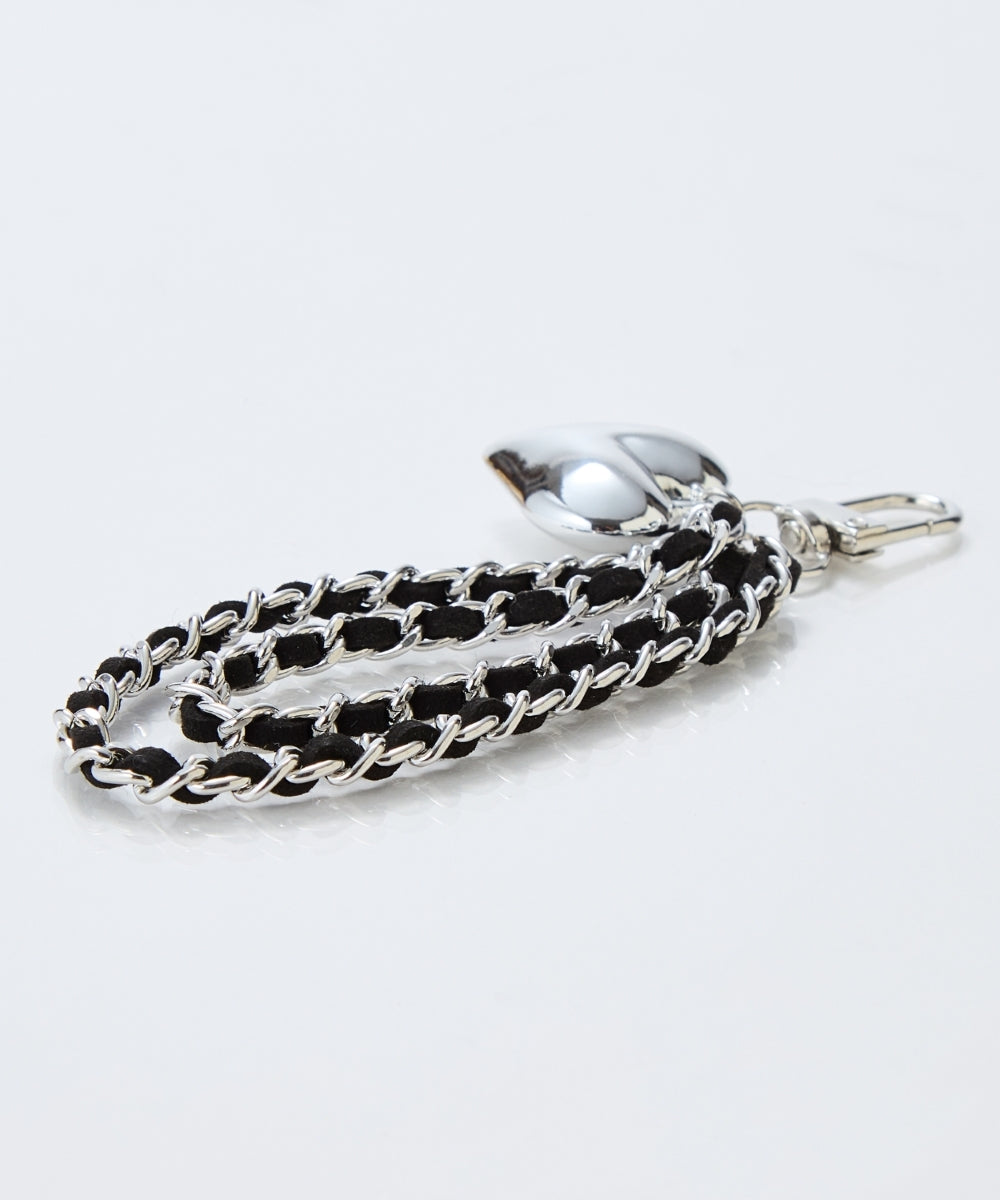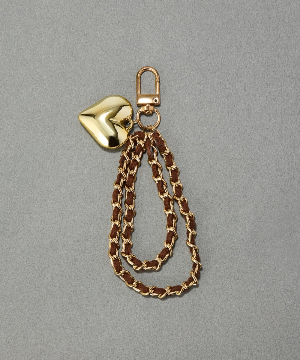 チェーンに丁寧に編み込んだスウェードコードに、ぷっくりハートのチャームが揺れてキャッチーなアクセントに。