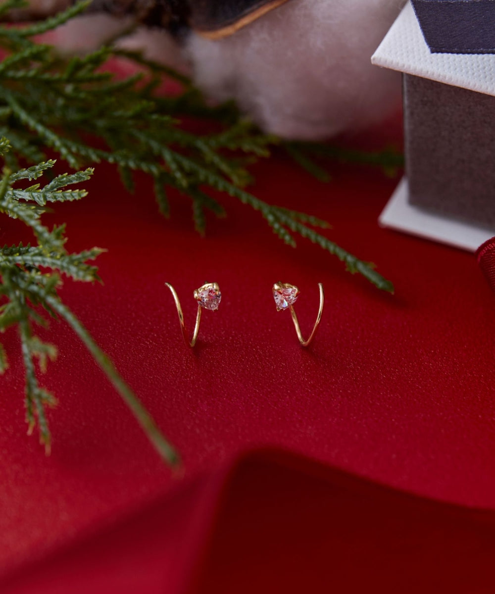 K10ローズゴールドカラーとハートカットのキュービックジルコニアがフェミニンなピアス。