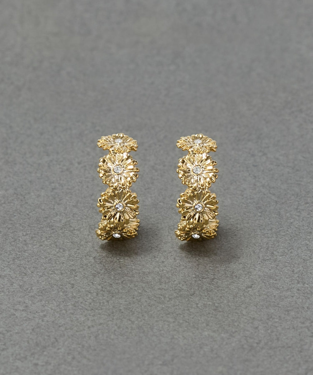 中央に輝くビジューと繊細に表現された花びらが、耳元で上品に光り、さりげなく華やかな印象を与えます。