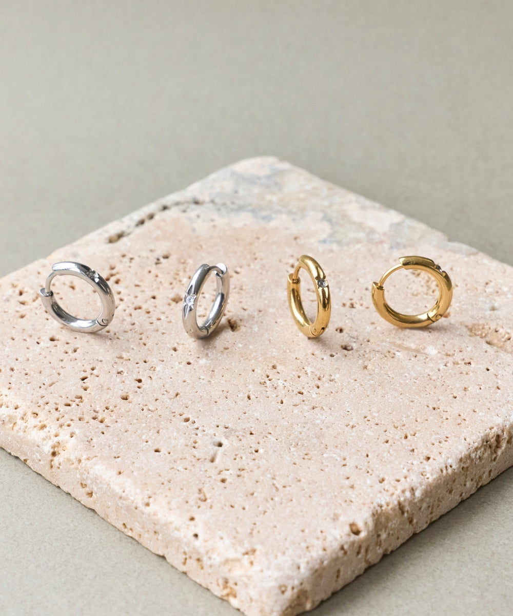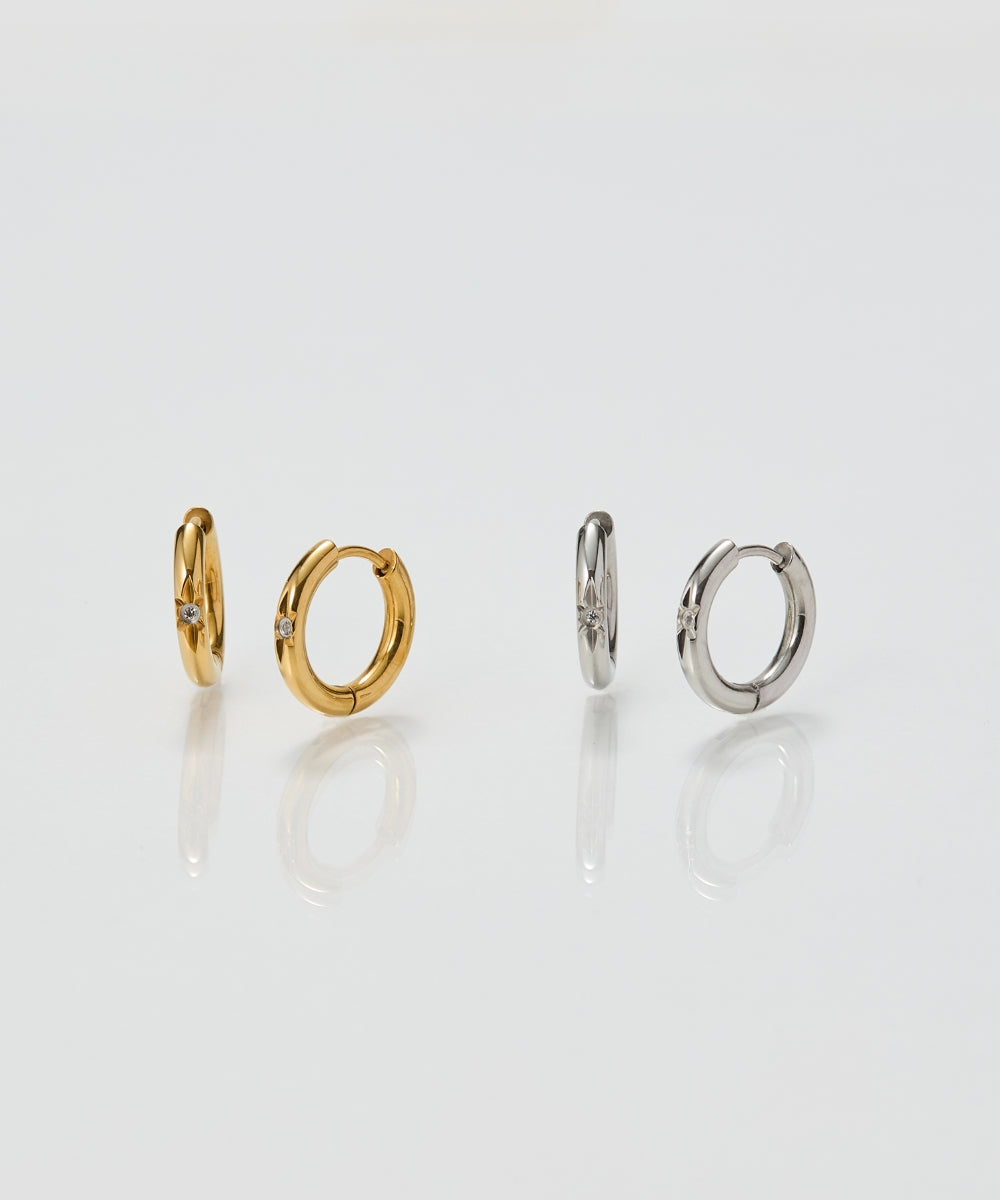 キュービックジルコニアの周りに星彫りを施した、さり気ない輝きが魅力のフープデザインです。
