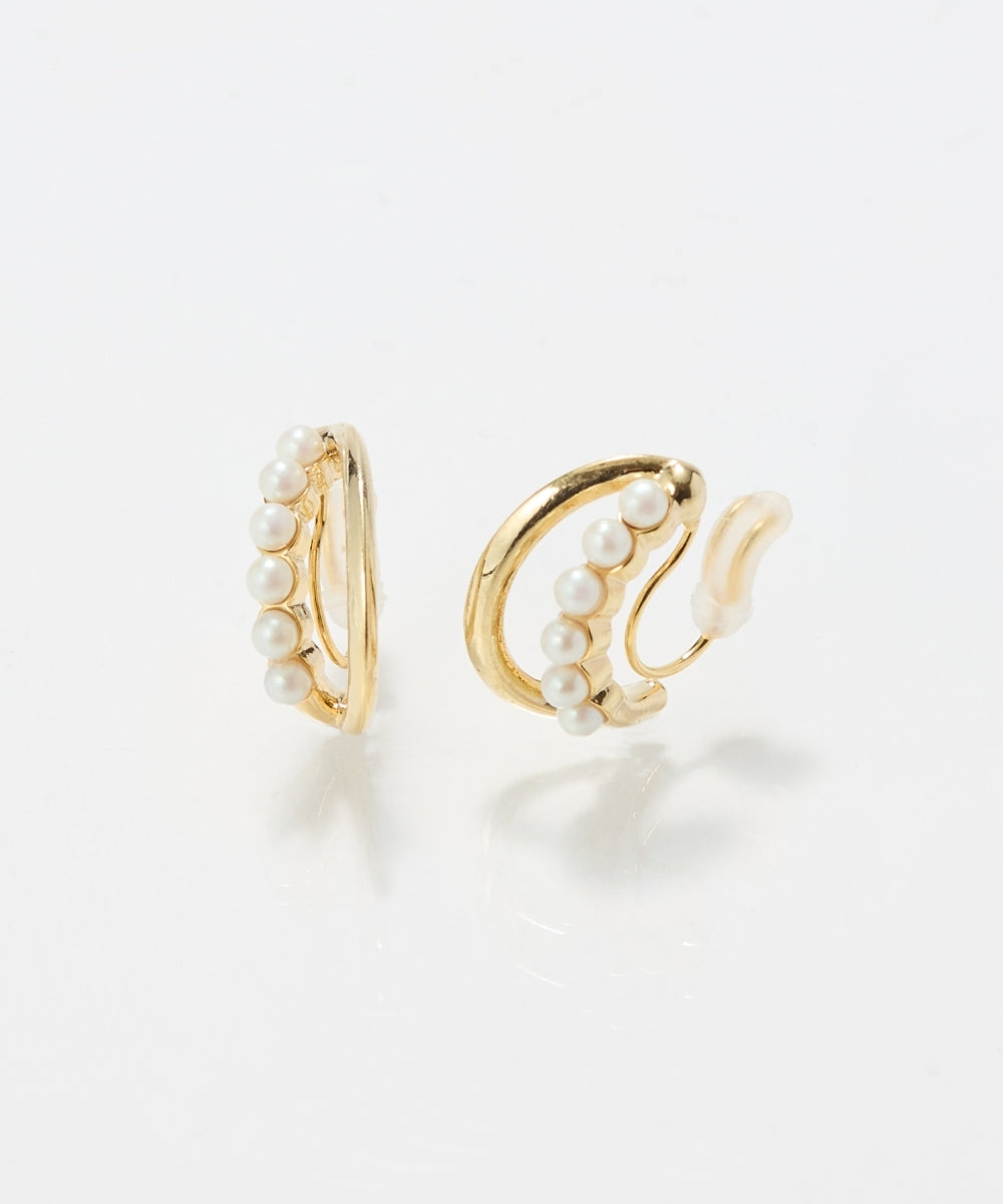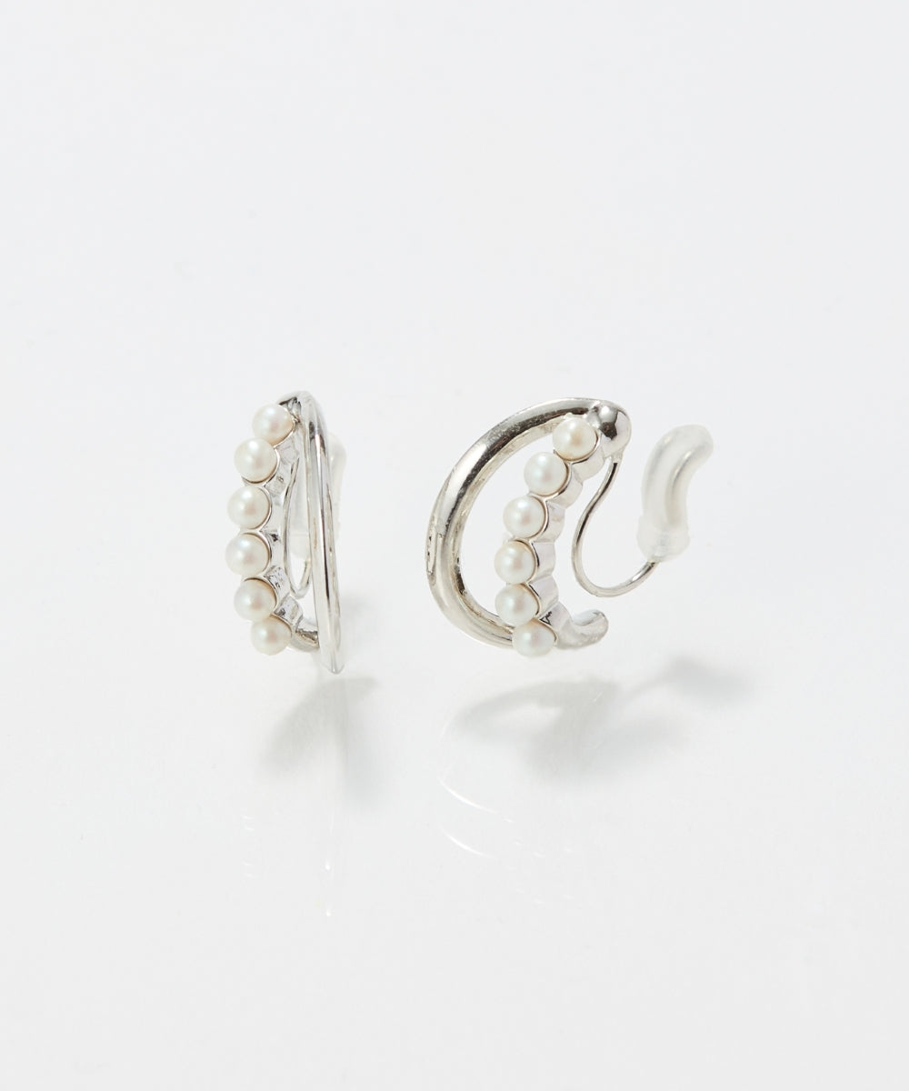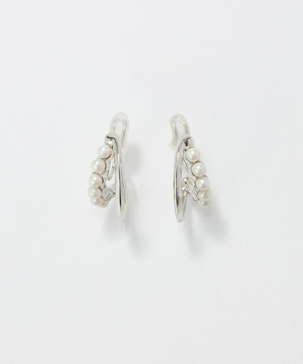 メタルラインに上品なパールをあしらったダブルハーフフープのライトフィットイヤリング。