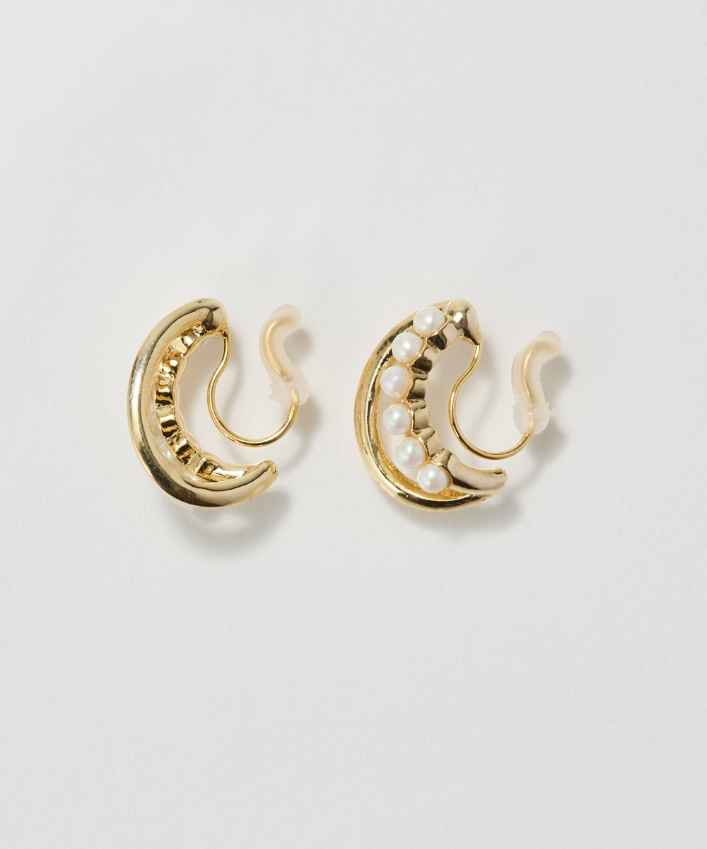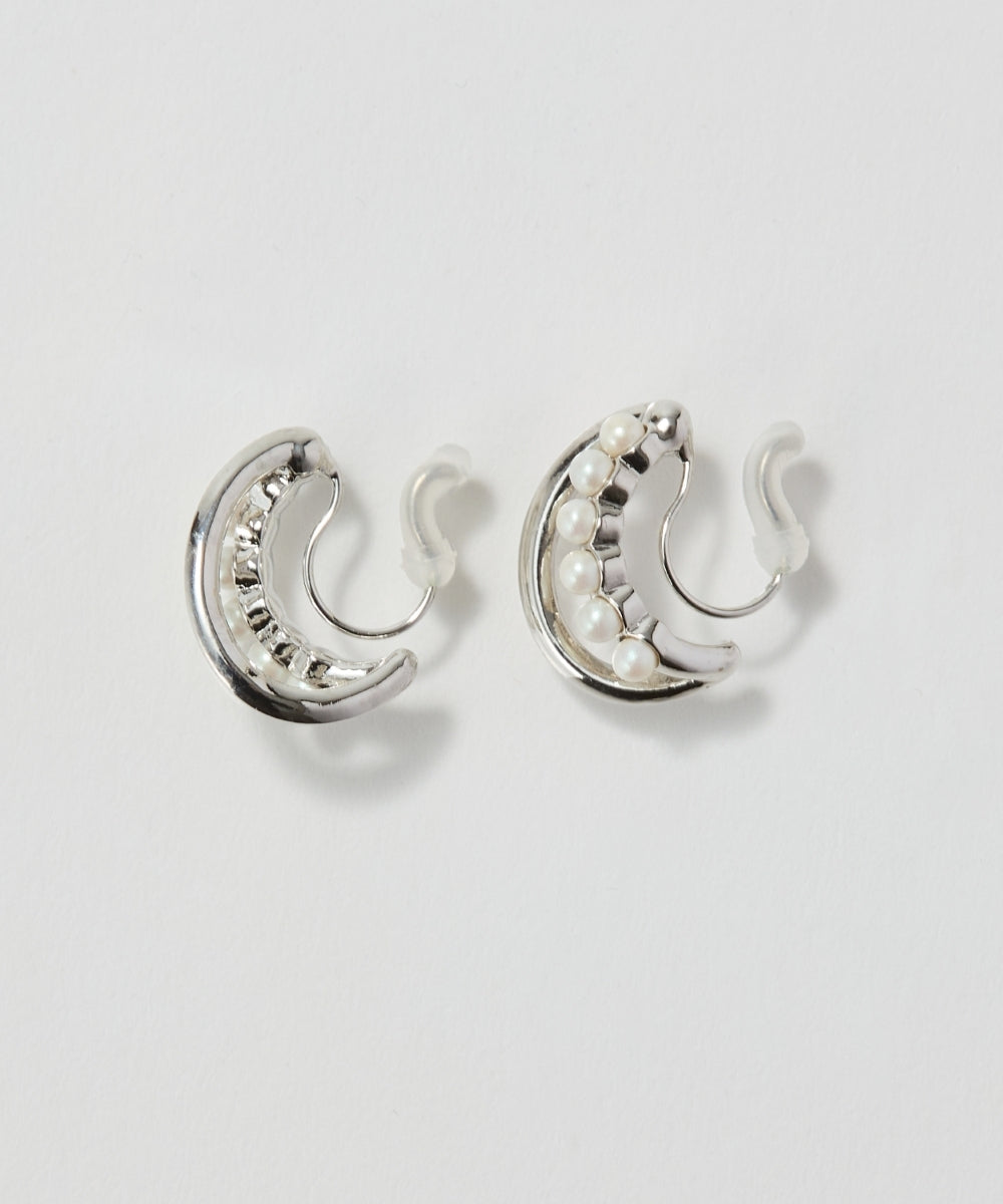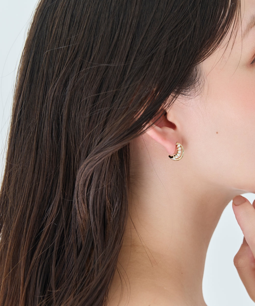 メタルラインに上品なパールをあしらったダブルハーフフープのライトフィットイヤリング。