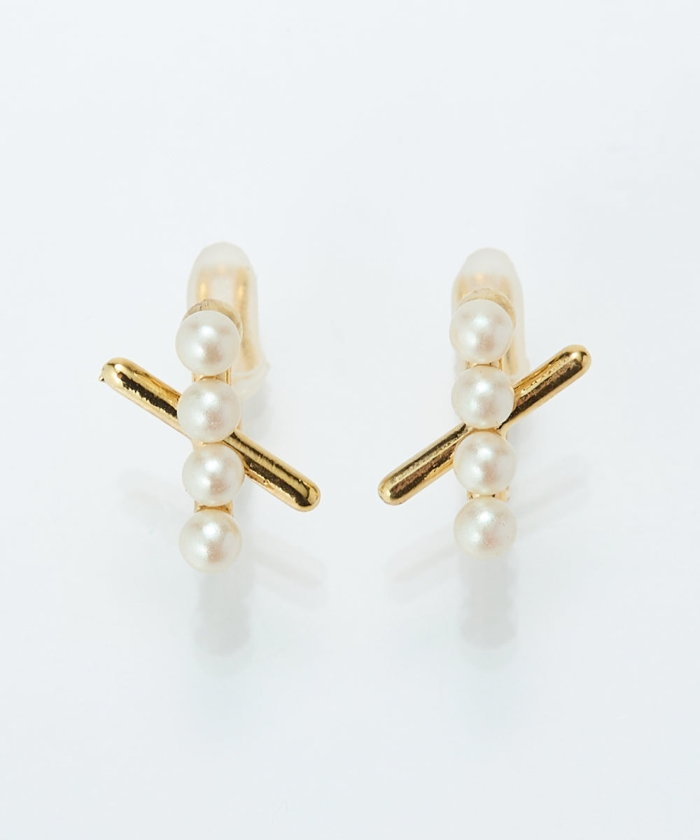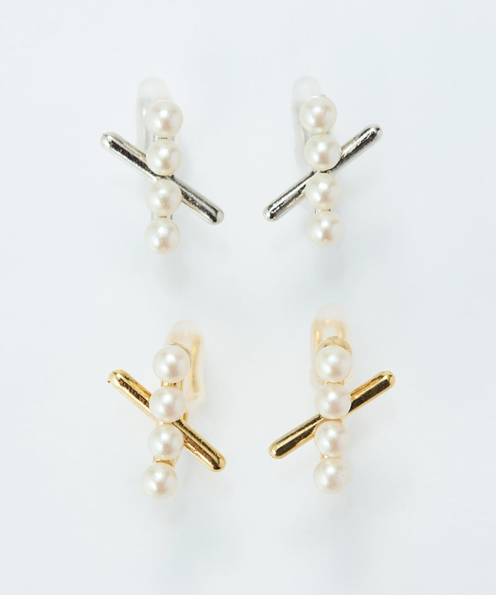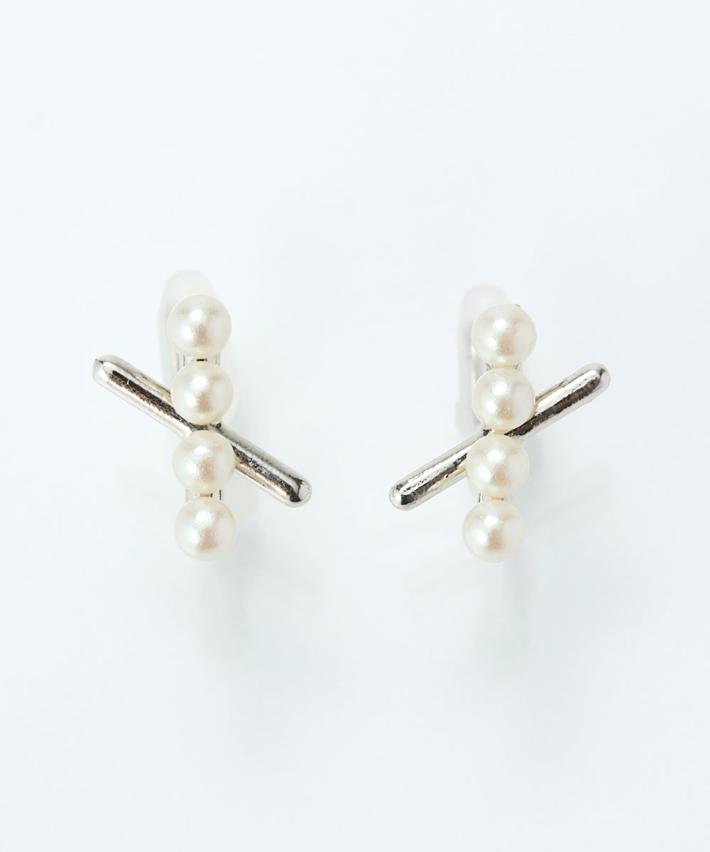 繊細なメタルラインとパールがクロスしたイヤリング。
