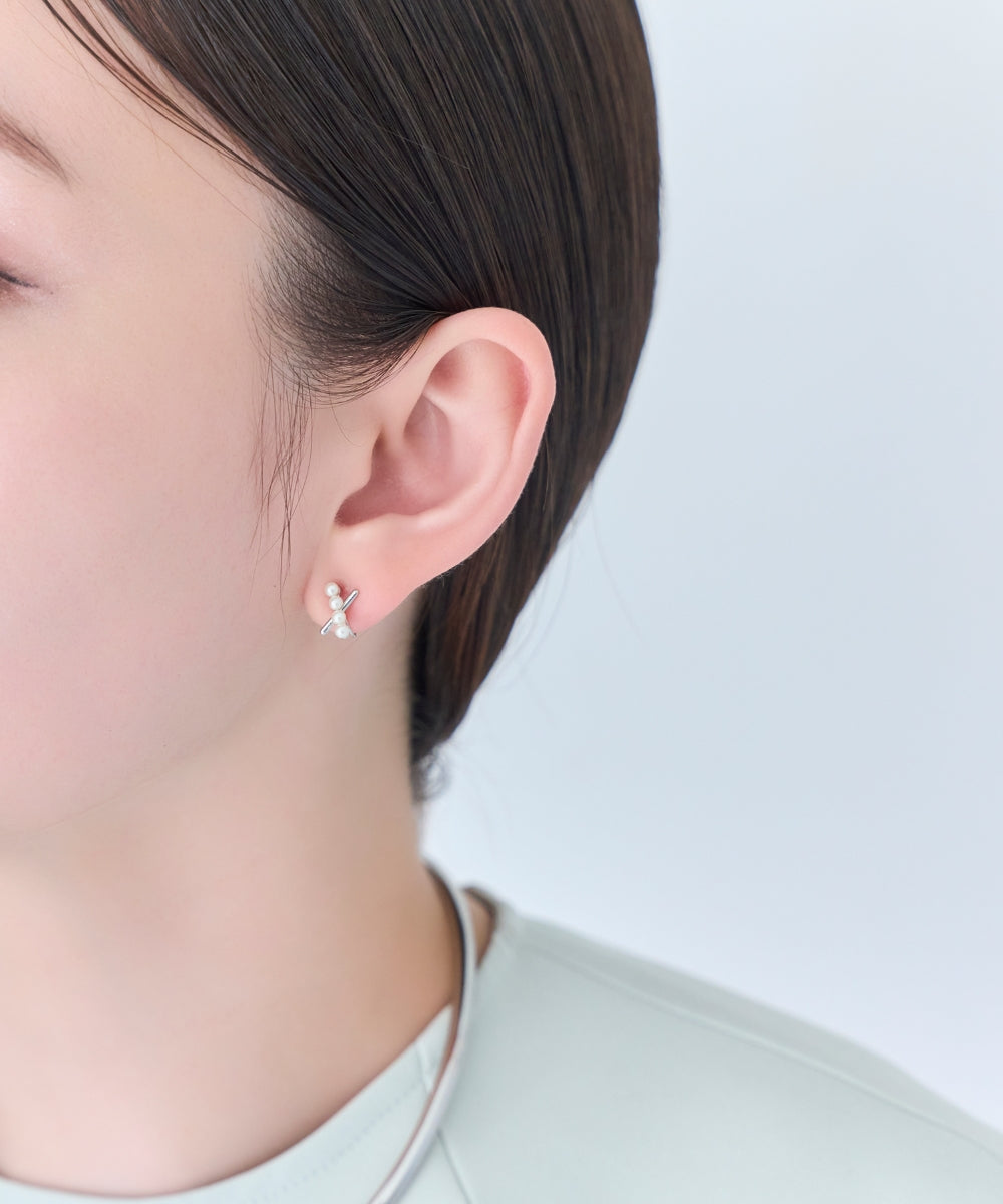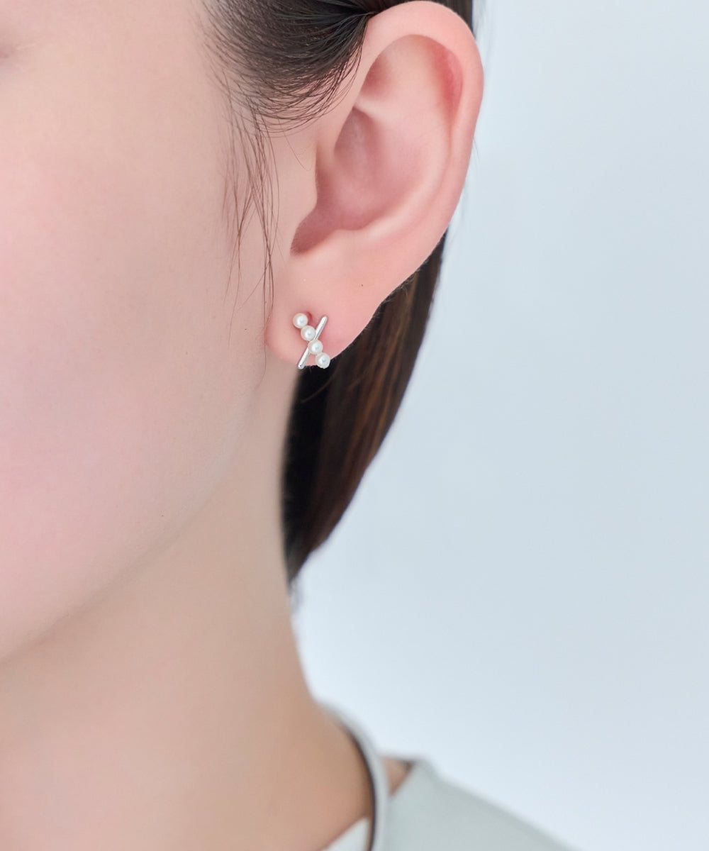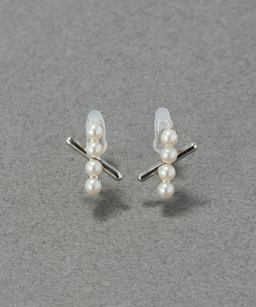 繊細なメタルラインとパールがクロスしたイヤリング。