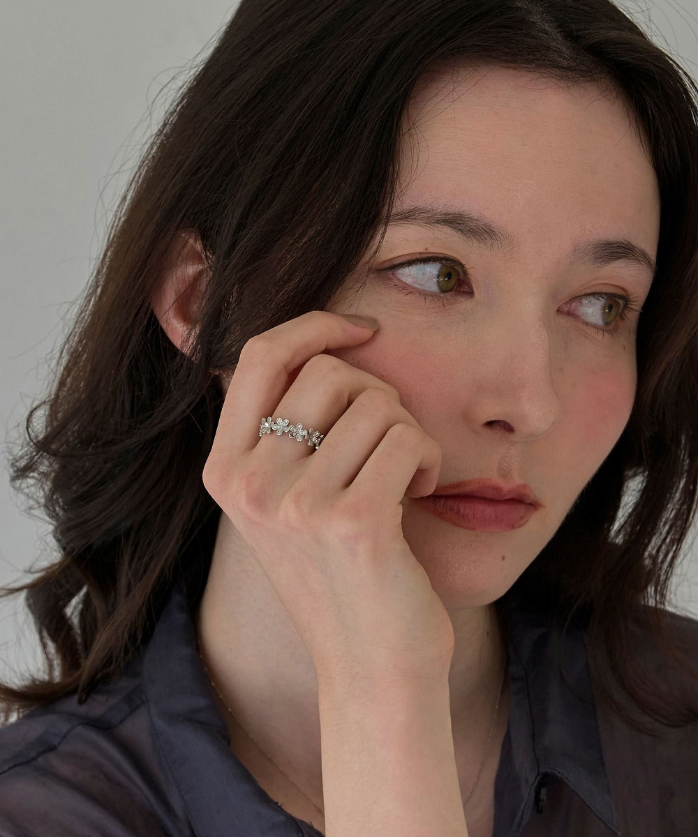 【まるで花冠のように連なるフラワーが、フェミニンな手元を演出するカフリング】
