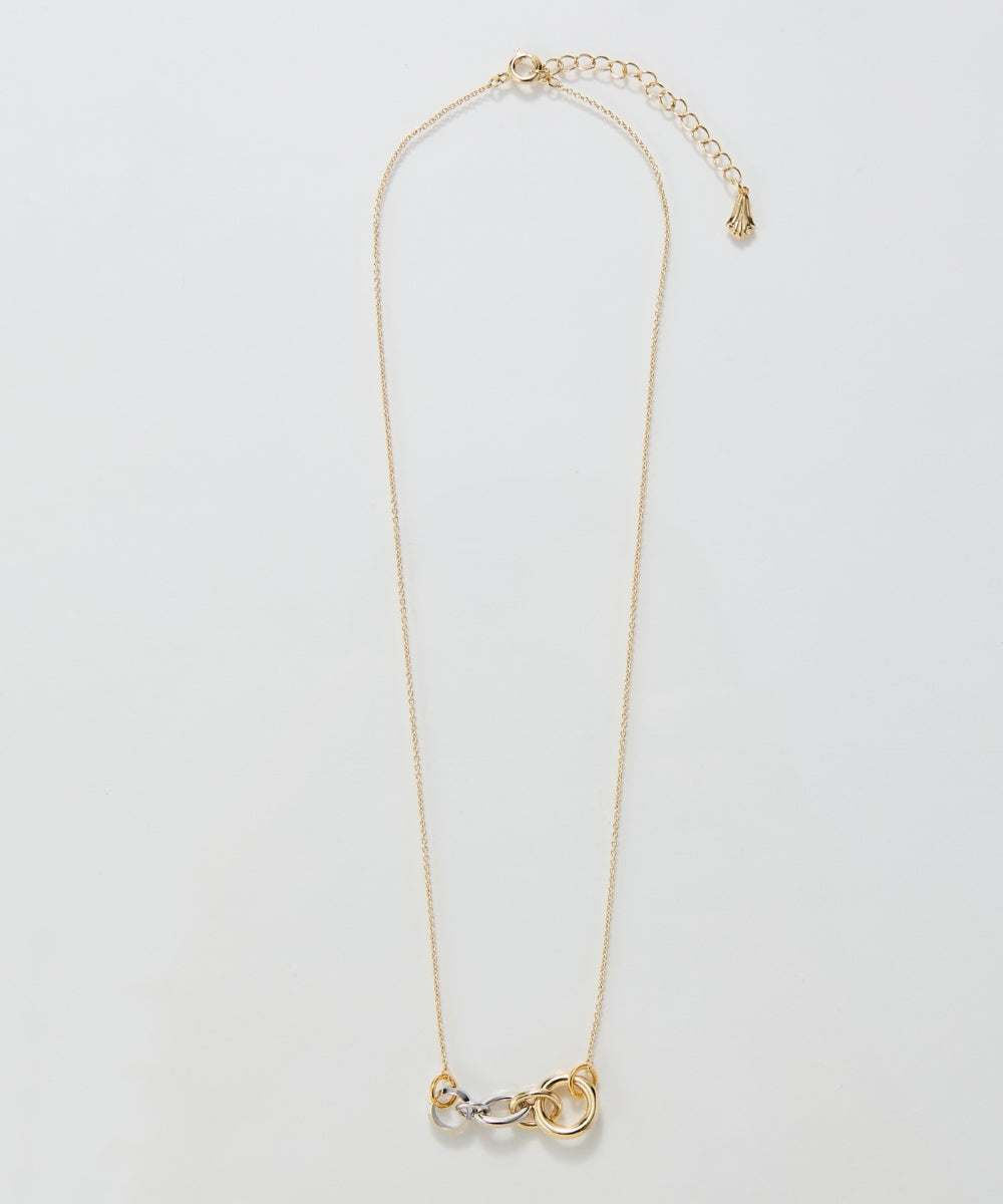 存在感のあるメタルフープを連ねたリズミカルなデザインに、ゴールドとシルバーのカラーをミックス。