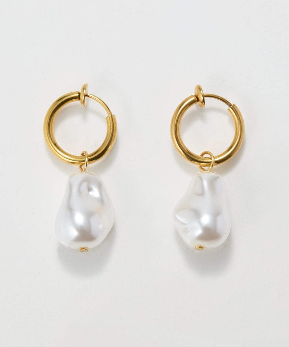 【ゴールドのフープに、美しいニュアンスを宿すバロックパールを合わせたモードなステンレスイヤリング】